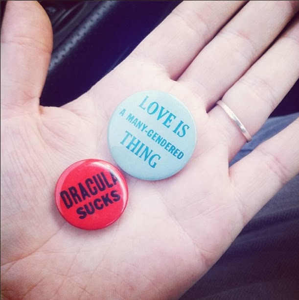 I found a whole board of buttons from the 1960's at a local antique mall. It was so hard to choose which ones to get! I passed up on "Jesus was a drop out" and "apple pie makes you sterile". I love these two!